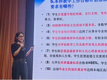 随后,张丽芳老师带领全体师生深入了解了本科教育合格评估的基本知识。她以一连串引人深思的问题开场:“什么是评估?评估的指导思想和核心内涵是什么?评估对于学生又有着怎样的影响?”紧接着,她逐一进行解答。她指出,评估就像是一把精准的标尺,其目的在于引导院校合理定位,推动学校改善办学条件,加强规范管理,完善校内质量保障体系,最终确保教学质量稳步提升。而“以评促建、以评促改、以评促管,评建结合,重在建设”的20字方针,正是评估工作的核心指导思想。合格评估的核心内涵——“四个促进,三个基本,两个突出,一个引导”,更是为学校发展指明了清晰的方向。张丽芳老师着重强调,我们广大学生是合格评估的最大受益者,评估结果将直接影响到我们今后的学习环境、教学资源,乃至未来的发展道路。