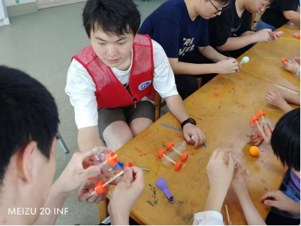 在制作过程中,孩子们充分发挥想象力,有的给小车设计了 “流线型车身”,有的用彩笔为瓶盖车轮画上独特花纹,还有的小组合作研究如何让小车跑得更快更远。志愿者们穿梭在孩子们中间帮着固定竹签支架、指导气球的绑扎方法、鼓励大家大胆尝试不同的组装方式。“原来奇思妙想飞跃指尖,竟可以化作翅膀的模样。”孩子们热情洋溢的讨论声与认真积极的动手实践,让整个活动室充满无限活力。