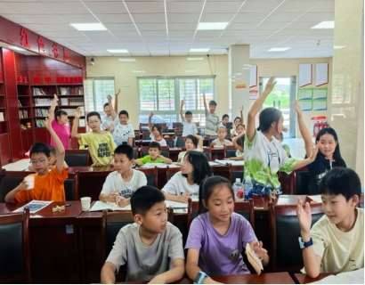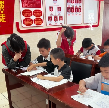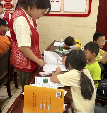 课间志愿者们化身“小老师”,对孩子们的暑期作业进行辅导,对不懂的问题和错题及时纠正解决,督促孩子们认真学习,高效地完成学习任务。