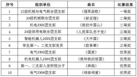 合唱曲目还有第一、第二支部入党积极分子带来的《奔跑》,智能机器人2201班带来合唱曲目《大中国》,机电机器人2301班带来的《我和我的祖国》,机电2301班带来的《我的中国心》,23级供用电合班带来的《人民军队忠于党》。