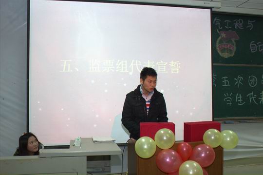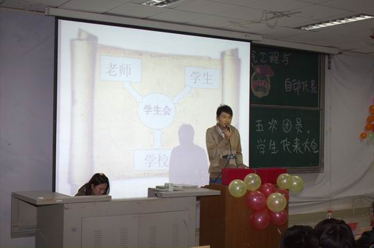 本次二代会由上一任学生会主席赵冬阳学姐主持。在会议的开始,系分团委书记漆良军老师就自己对生活上的一些感悟与众学生代表分享,很多总结出来的经验和教训都让我们受益匪浅,其中表露出来对电气系的浓厚情感也让我们尤为感动。漆老师还对新一届学生会成员提出了以下三个要求:1、把简单的事情做好,并且始终如一;2、每一位同学积极一点,主动一点,让自己收获多一点;3、给自己多一些思考,多一些经历,多一些改变。随后会议进入了第二部分,赵冬阳学姐对学生会在过去一年里的工作进行了总结,向众学生代表汇报,众学生代表用热烈的掌声表示通过。整个大会由老师和学生的工作报告正式进入大会的重要部分,他们的工作报告让我们对系学生会在过去一年来的工作开展情况及收获成果有了更深入的了解,这也让我们每一位在座的同学倍感骄傲,因为真的是硕果累累。虽然成绩仅仅只能代表着过去,但这也激励着这一届学生会工作的新起点。紧接着便是本次二代会的换届选举演讲时间。七位候选人每人利用五分钟的时间进行选举演讲,并接受众学生代表的提问。参选的同学们满怀自信跨上讲台,全场的气氛在刹那间被这青春的激情引燃,把学生会换届选举会议推向高潮。庄重的誓言、热烈的掌声交织相映、此起彼伏!竞选者用精彩纷呈的演说,巧妙的应答一次次赢得全场如雷般的掌声,用真诚和自信获得了学生代表们的阵阵好评。其中,陈定、任世轩等同学出色又饱含真挚情感的演讲给我们留下了深刻的印象。他们脸上书写着执著与热情,从他们慷慨激昂的演说中可以看出他们对于系学生会工作的认真和重视。从他们身上也让大家看到了电气系学生会更加辉煌的明天。之后由众代表进行不记名投票选举,从7名候选人中选出4名同学担任学生会主席团的职务。其后,由我系学生会前任分团委副书记周亚武学长为我们宣读“校园环保倡议书”,并倡导每一个出席会议的人都把这份倡议书与身边的同学分享。会议的最后一部分是对过去一年里表现优秀的学生会干事李雅婷、刘盈盈等同学颁发奖状并进行嘉奖。