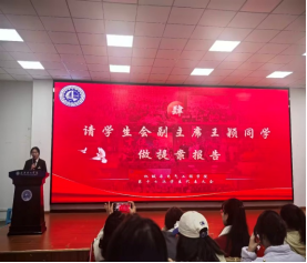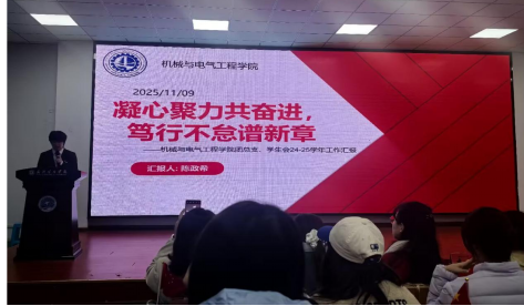 接着,学院学生会主席陈政希开展了学院2024-2025学年团总支、学生会工作汇报。报告以“凝心聚力共奋进、笃行不怠谱新篇”为主题,从四个方面为下一步工作锚定了坐标,指明了方向。第一是打造负责任、肯吃苦的骨干队伍,贯彻落实优良作风,构建严谨的制度体系;第二是打造学院品牌文化,对学生会同学们的优良作风借助新媒体宣传,加强思想引领作用;第三是营造积极向上的学风氛围,以获得省奖国奖为目标,鼓励参加学科竞赛,促进学生素质发展;第四是提升文明素养和综合素质,共同营造优秀宿舍文化、积累志愿实践经历等。最后,他以“未来属于奋斗者,青春属于追梦人”为报告画上了圆满的句号。