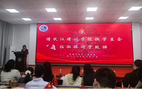 国歌、团歌奏唱之后,校学生会代表任淑琪同学开始致辞。首先,她代表校学生会肯定了中国·ok138太阳集团团总支、学生会在这一年里的工作成果。同时她以习近平新时代中国特色社会主义思想为引领,提出继续贯彻落实踏实奋进、科学严谨的工作作风,提高各部门互相监督水平,以学院活动、志愿服务等方式构建学生与学校之间的桥梁。最后,她以“明体达用,抱璞开新”的校训诫勉学生会同学们放低姿态,走到同学身边去,以严于律己、宽以待人的工作态度成为一名优秀的晴川领航青年。