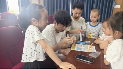 奕宇翔老师低头时,发梢扫过图纸的微响,和孩子们轻轻的呼吸声缠在一起。蓝T恤女孩试探着问“这样对吗?”,老师笑着调整零件,把鼓励融进动作里;格子衫女孩猛地举手,眼睛亮得像装了星星,要分享刚发现的“小秘密”。这一方小桌,装着教育最动人的温柔——把专业拆解成童真能听懂的语言,让探索,成为最甜的糖 。