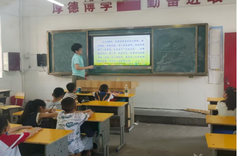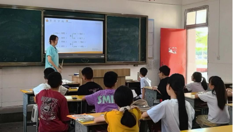 志愿者针对不同年级段分层实施不同教学方案。语文课上,邹子豪老师给孩子们讲古诗词由来,帮助理解诗人作诗意境。老师以春日美景引出杜甫描绘春光的绝句,板书诗题与作者,让学生谈对诗题的理解。初读时,老师范读,学生自由朗读并纠正发音后齐读,确保朗读流畅有节奏。品读环节,老师引导学生找出诗中春日景物,解析“两个黄鹂鸣翠柳,一行白鹭上青天”,让学生感受生机;讲解“窗含西岭千秋雪,门泊东吴万里船”,结合画面体会景色深远开阔。最后,老师让学生带着对春光的喜爱朗读并适时点评,加深对诗句意境的感悟。