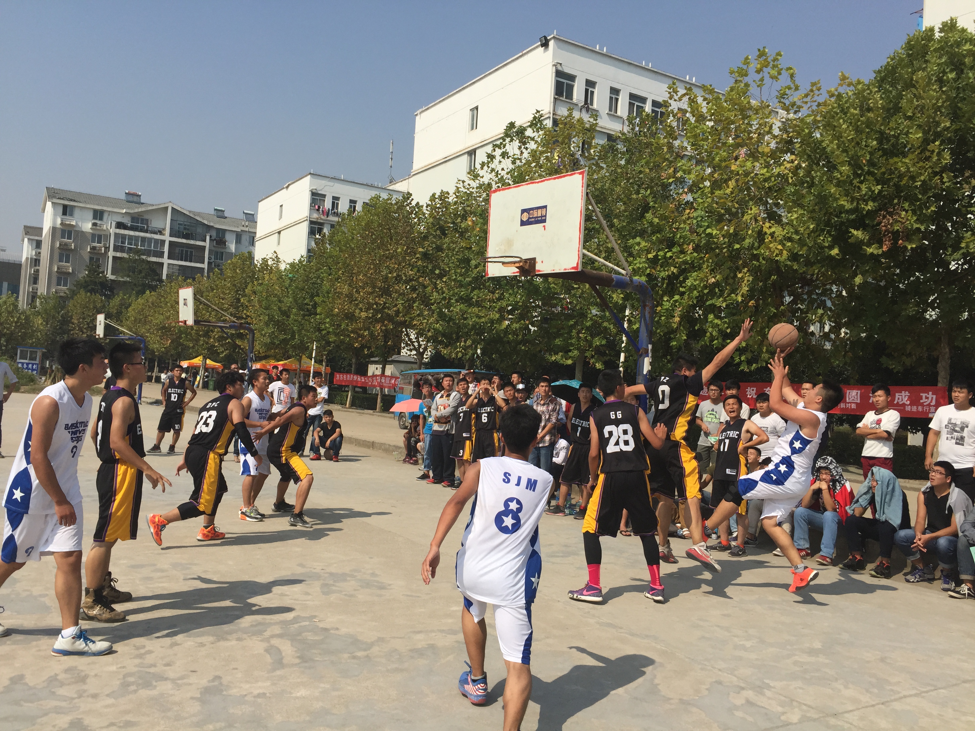 15日中午十二点,电气系首发,对战英语系。兴许是傲慢自大,电气系的队员之间配合较少,主要是单兵作战,前三节比完后,比分呈25:11,英语系暂时领先。但电气系的队员们却并没有认输。在第四节的时候,队员们反思问题,燃起斗志,开始有了配合,进攻、防守都有理有条,攻守兼备,比分差距被迅速拉小。随着电气队员一个漂亮的三分入篮,电气反超英语,电气系围观群众们的热情都被点燃了,加油声此起彼伏。但是英语系却在本节最后的十秒钟进了最后一球,比分又一次被拉平。