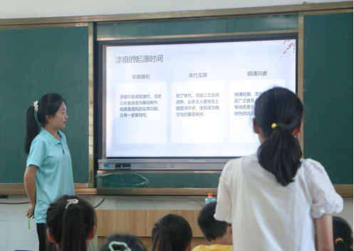 在动手DIY环节,曾悦与邹子豪老师通过视频的方式向同学们展示了简易漆扇的制作过程。孩子们在指导下,亲手挑选心仪的扇面图案,小心翼翼地将漆料滴入桶中,每一笔都凝聚着他们对传统文化的热爱与尊重。